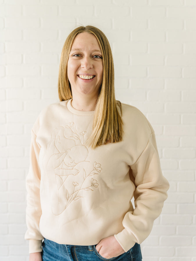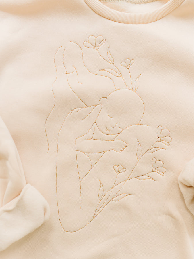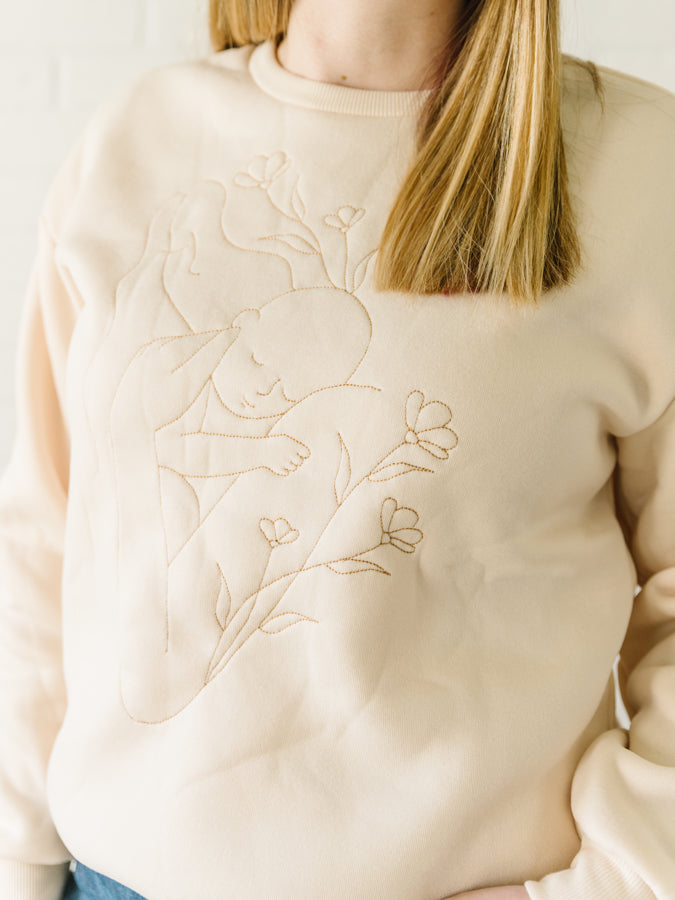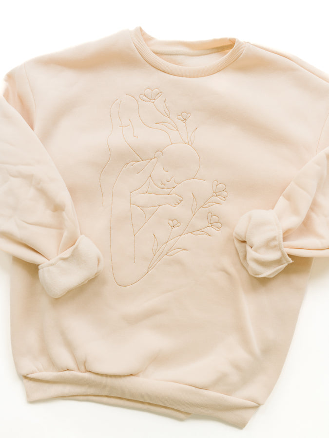 This cozy sweatshirt is more than just comfortable; it's a heartwarming tribute to the special connection between mother and child. Featuring a delicate line art embroidery of a mother holding her baby, it's a symbol of love, nurture, and everlasting connection.